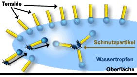 Die Tenside sind „oberflächenaktiv“, d.h. sie wollen eine möglichst grosse Oberfläche. Dies bewirkt, dass Schmutzpartikel von den Tensiden umlagert werden und in den Wassertropfen einwandern - dies wirkt schon aktiv reinigend. Das Wasser transportiert den Schmutz in den Eimer.Die oberflächenaktive Wirkung der Tenside wirkt dem kohäsiven (Oberflächenspannung und Zusammenhangskraft) Bestreben des Wassers entgegen. Die Benetzfähigkeit des Wassers wird dadurch deutlich verbessert.Dies führt zu dem bekannten Schaumeffekt, den die Tenside aufgrund Ihrer Oberflächenaktivität hervorrufen.