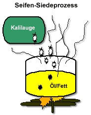 Früher stellten die „Seifensieder“ die Seife (Tenside) her, indem sie Fett bis zum Kochen (sieden) erhitzten. Man gab Kali (Lauge) in die erhitzte Fettmasse und es entstand Seife. Dazu wurden pflanzliche und tierische Fette verwendet.Was passiert dabei?Unter der Hitze spaltet sich Fett in Fettsäre und Glyzerin (Alkohol). Gibt man dann Lauge dazu, neutralisieren sich Lauge und Fettsäure und es entsteht ein Salt (Tensid). Vom Fett/Öl bleibt als Rückstand Glyzerin.