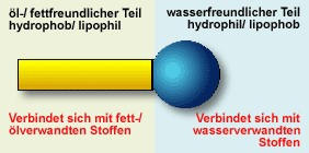 Gibt man Reinigungsmittel (zB. Seife) dazu und rührt die Mischung durch, erreicht man ein Emulgieren der verschiedenartigen Flüssigkeiten.Die emulgierenden Stoffe sind Tenside.Tenside bewirken ein zusammenhängen von Wasser und Öl.Tenside sind die Anhängekupplung die das Wasser bekommt, damit es Fette und Öl mitnimmt.